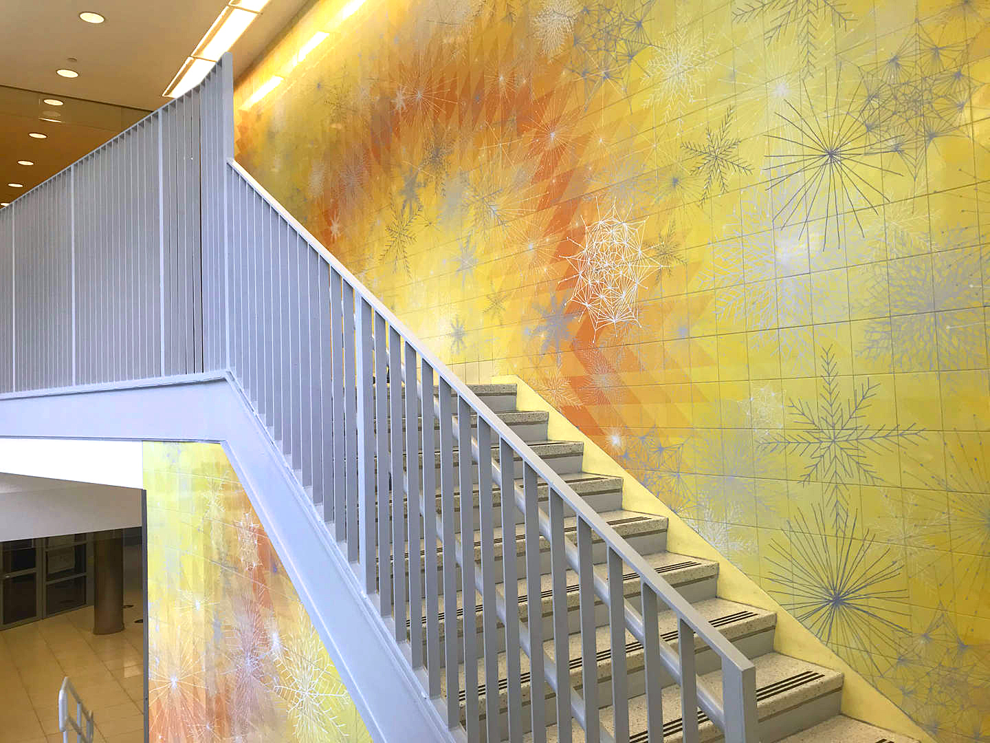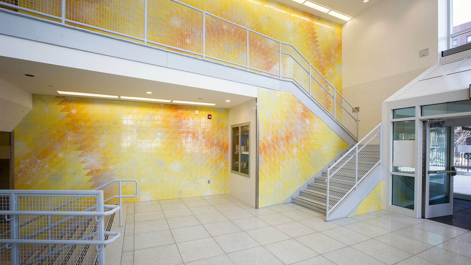 This brilliantly-colored artwork by Sandra Cinto was transformed into a multi-story mural spanning over 2,000 6″ x 8″ high-gloss tiles.